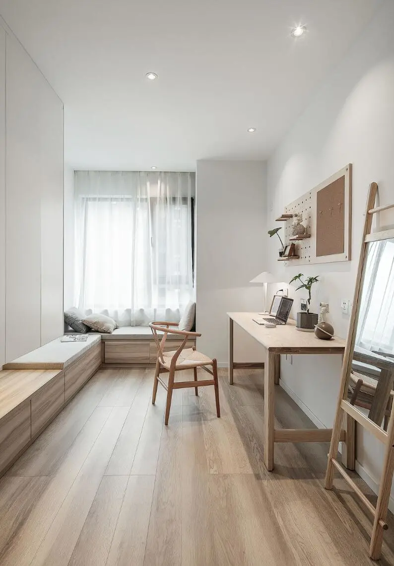 左邊是一組懸掛式儲物柜,代替衣帽間的功能。底部L型的飄窗柜設(shè)計,休閑愜意