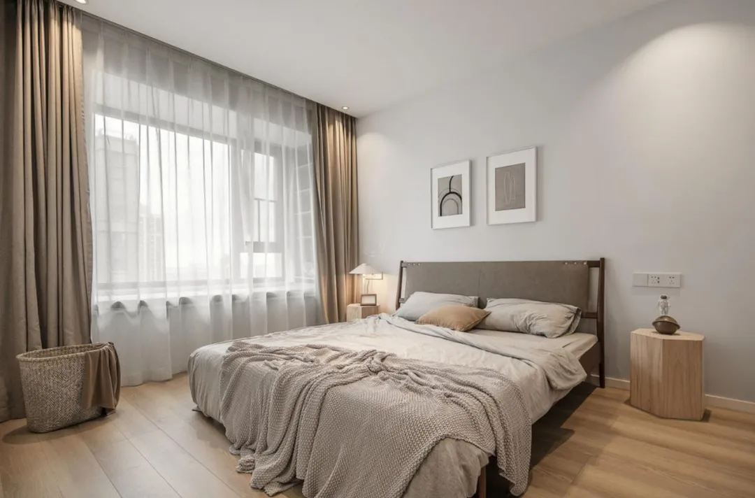 主臥空間設(shè)計很簡單,灰色的床品搭配卡其色窗簾,還有木地板,整體色彩協(xié)調(diào),空間簡約溫暖。