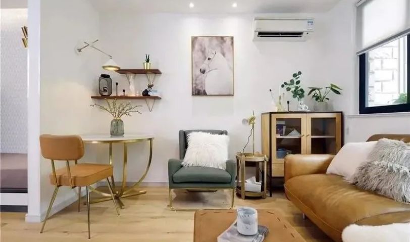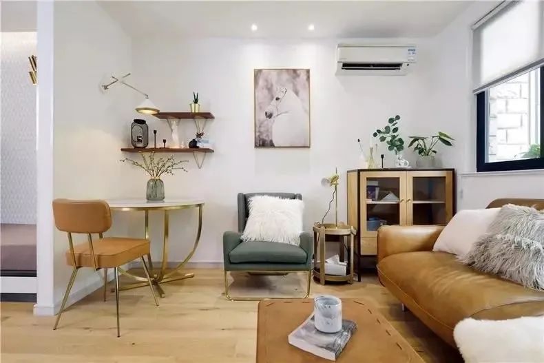 客餐廳連在一起,北歐風(fēng)融合現(xiàn)代風(fēng)的設(shè)計(jì),金棕色軟裝家具配飾使得狹小的空間也能盡顯精致