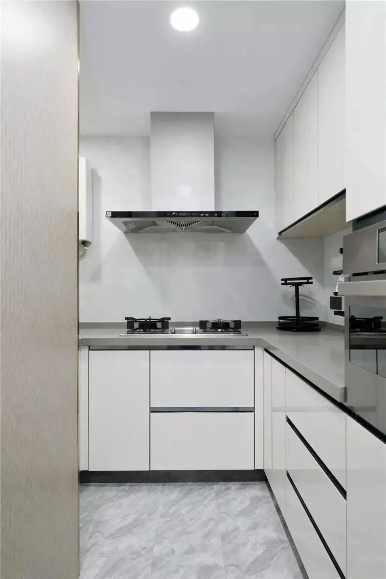 廚房黑白雙色設(shè)計(jì),精致典雅,L型櫥柜有足夠的收納,封閉式設(shè)計(jì),避免油煙侵?jǐn)_。