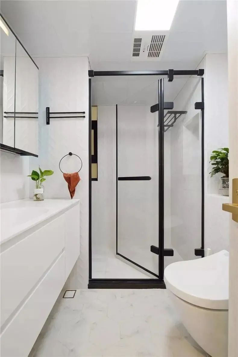 黑框玻璃淋浴房,延續(xù)了客廳電視柜和衣帽間的風(fēng)格,六角瓷磚地面的選擇不同以往,淡雅中增添了一絲趣味,而且更加輕盈整潔。