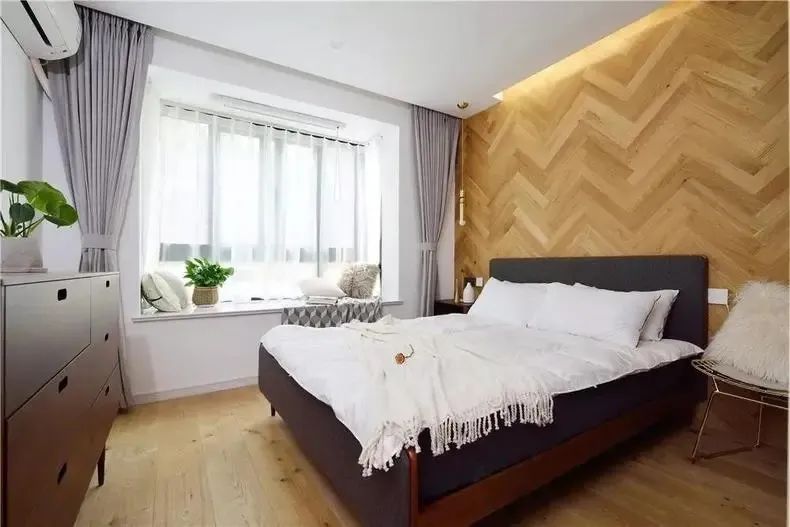 臥室大氣而優(yōu)雅,隨意自然。步入式衣帽間選擇了無門套嵌入上軌的窄邊框灰色玻璃移門,和電視柜的黑玻璃門對(duì)應(yīng),平日黑漆漆一片,但是當(dāng)打開燈光,隱秘的魔法衣帽間閃亮登場(chǎng)。