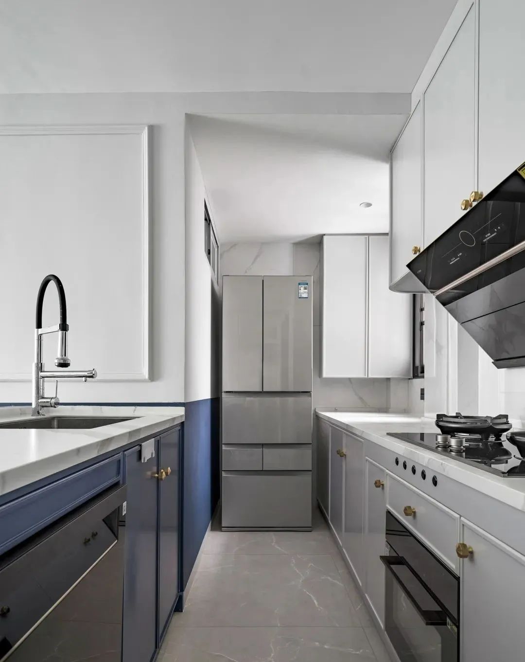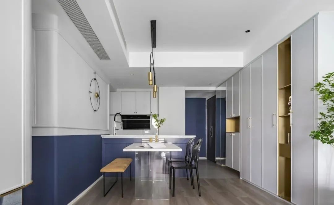 開放式廚房鏈接餐廳島臺,色調(diào)十分沉穩(wěn)大氣,通透的質(zhì)感,又增添了幾分開闊感。