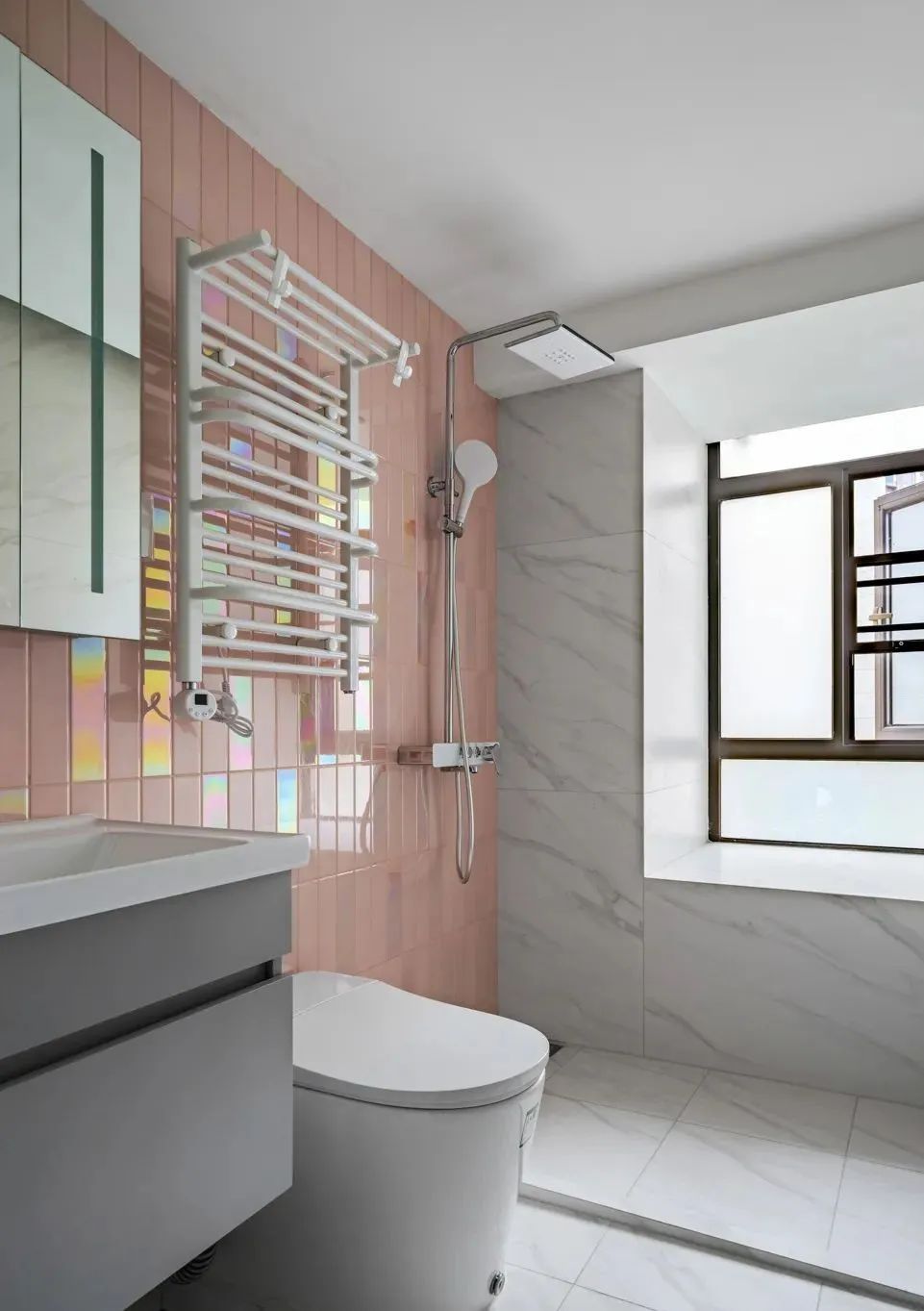 “光”的造型,是視覺的牽引與趣味彰顯。洗漱臺外置,洗手間采用鏡柜設(shè)計(jì),升級收納功能。