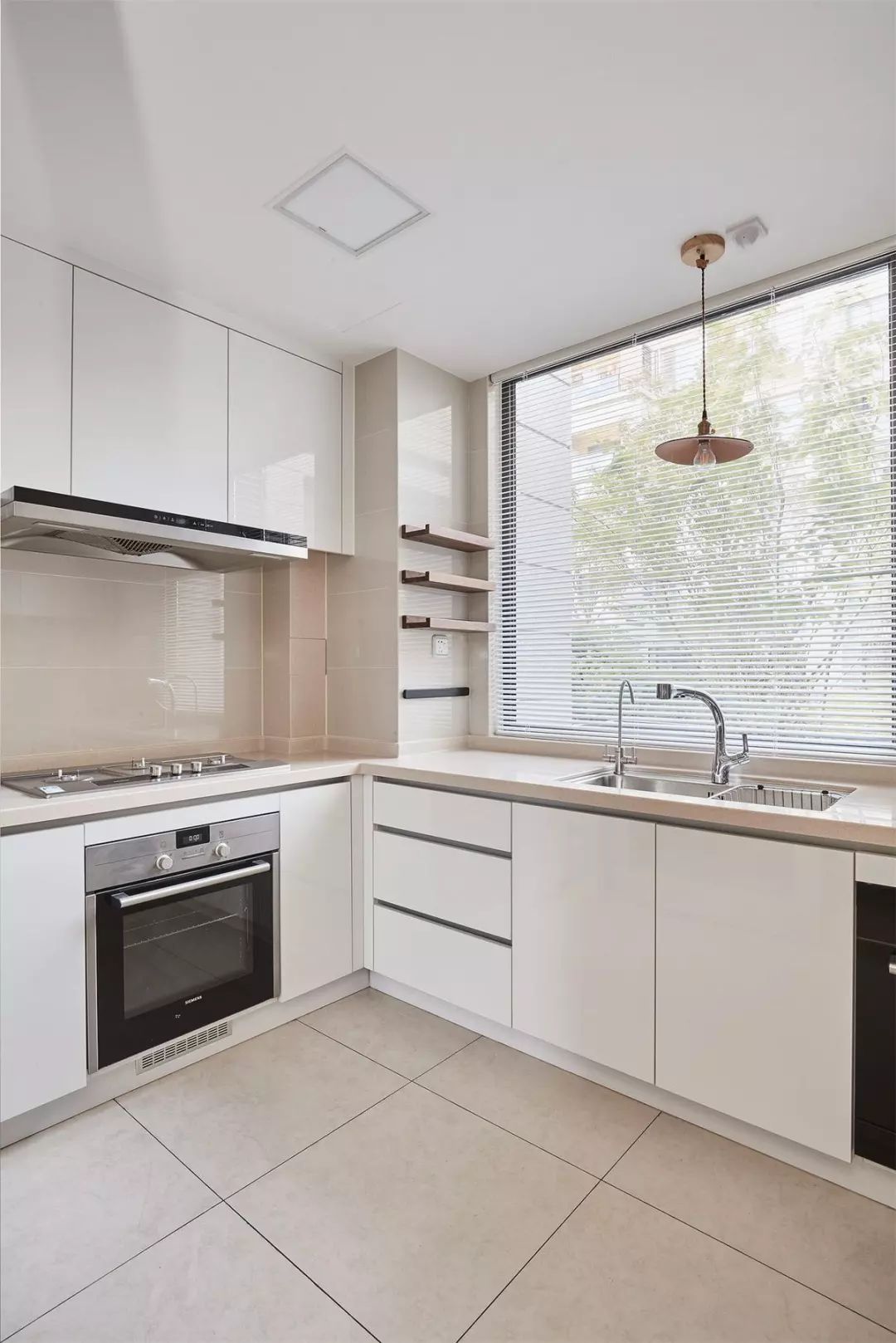 廚房?jī)?nèi)部光線比較好,而且屋主還選擇了白色的櫥柜門,搭配米色的墻地磚、臺(tái)面,整個(gè)廚房給人一種溫馨、簡(jiǎn)潔的感覺。