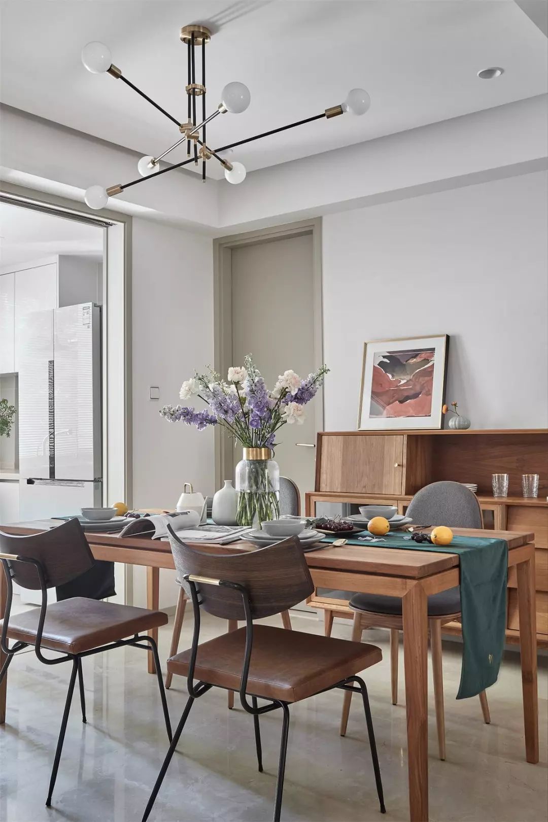 餐廳處選擇了復(fù)古的餐椅搭配原木風(fēng)的餐桌,側(cè)方一個(gè)木制的餐邊柜上擺放著裝飾畫,頂部的創(chuàng)意吊燈也讓餐廳看起來更加高大上。