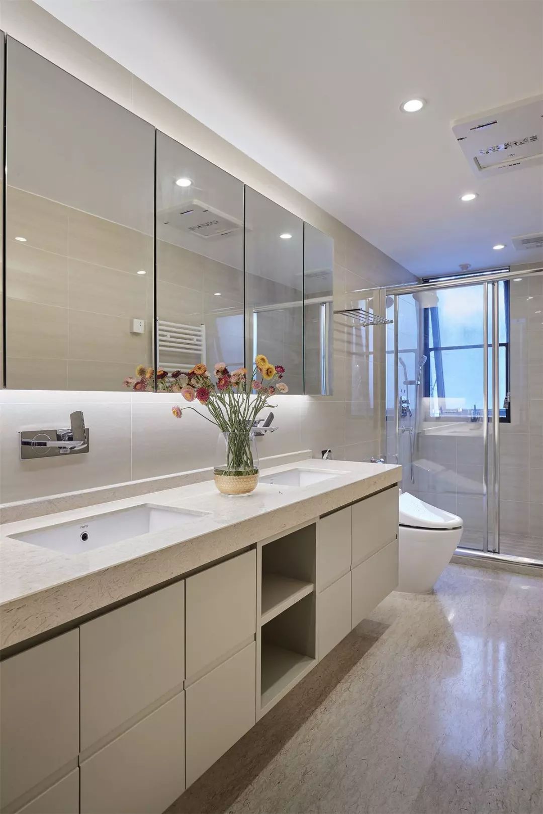 衛(wèi)生間內(nèi)部干濕分離,還做了雙臺(tái)盆的設(shè)計(jì),把鏡柜做到和洗手臺(tái)一樣的寬,讓衛(wèi)生間的空間視覺感得以延伸,浴室柜和鏡柜組合起來,收納空間也更多。