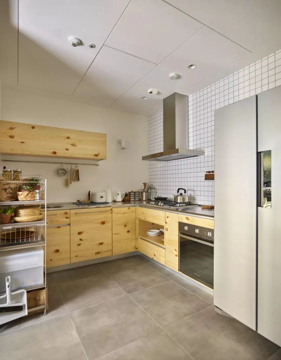 廚房內(nèi)部做了L型的櫥柜,還和生活陽臺相連。水泥質(zhì)感的地磚搭配原木風(fēng)的櫥柜,在簡潔輕松當(dāng)中有著質(zhì)樸鄉(xiāng)村的感覺