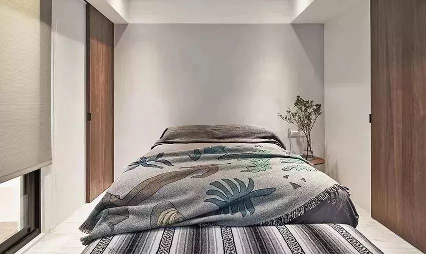 主臥簡(jiǎn)潔而又大方,床頭背景墻刷成了灰色,用小茶幾來(lái)代替床頭柜,臥室內(nèi)部舍棄了柜子之后,顯得更加的輕松、舒適