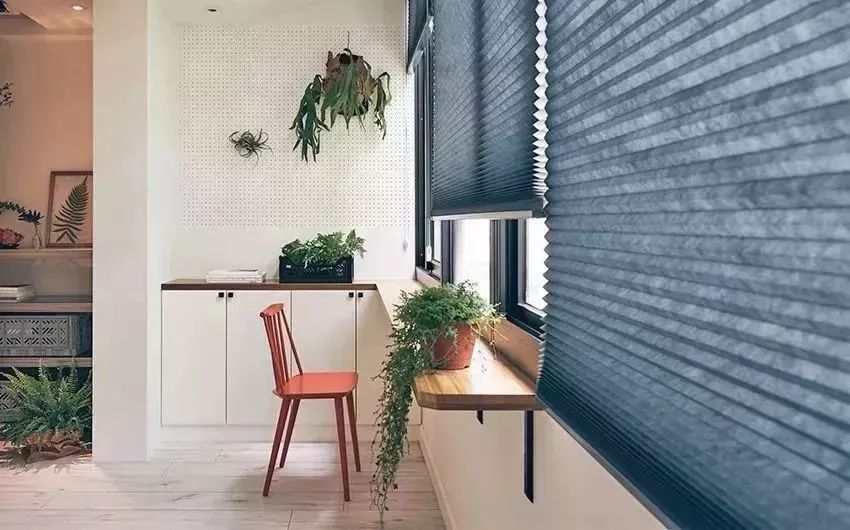 利用靠窗的位置來(lái)做了書(shū)房,柜子和長(zhǎng)隔板的組合,用百葉簾作為窗簾,陽(yáng)光被折疊之后,顯得更加的柔和、舒適