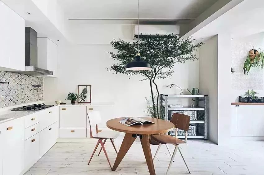 餐廳和開(kāi)放式的廚房集合,櫥柜是靠著墻面設(shè)計(jì)的L型櫥柜,原木風(fēng)的餐桌椅搭配角落里的綠植和收納架,實(shí)用又美觀(guān)。