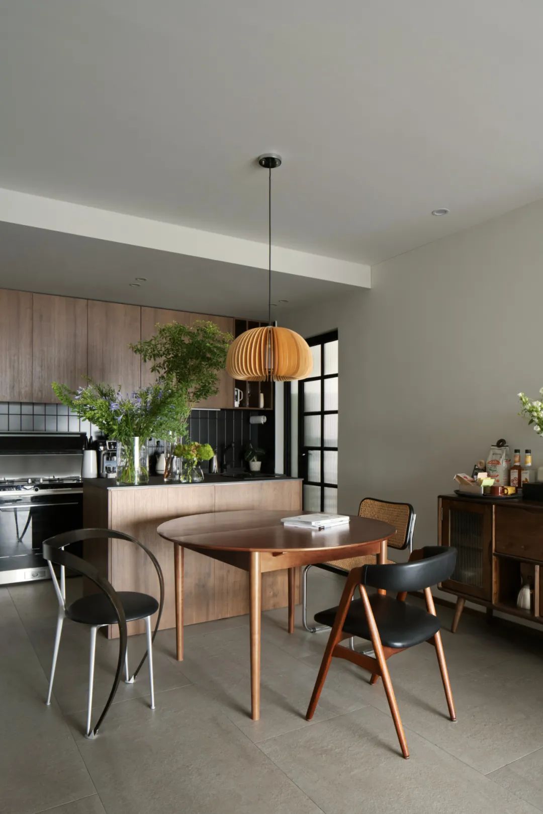 木質(zhì)餐邊柜承擔(dān)用于補(bǔ)充客餐廳的收納,顏色上也和其他家具相搭配。