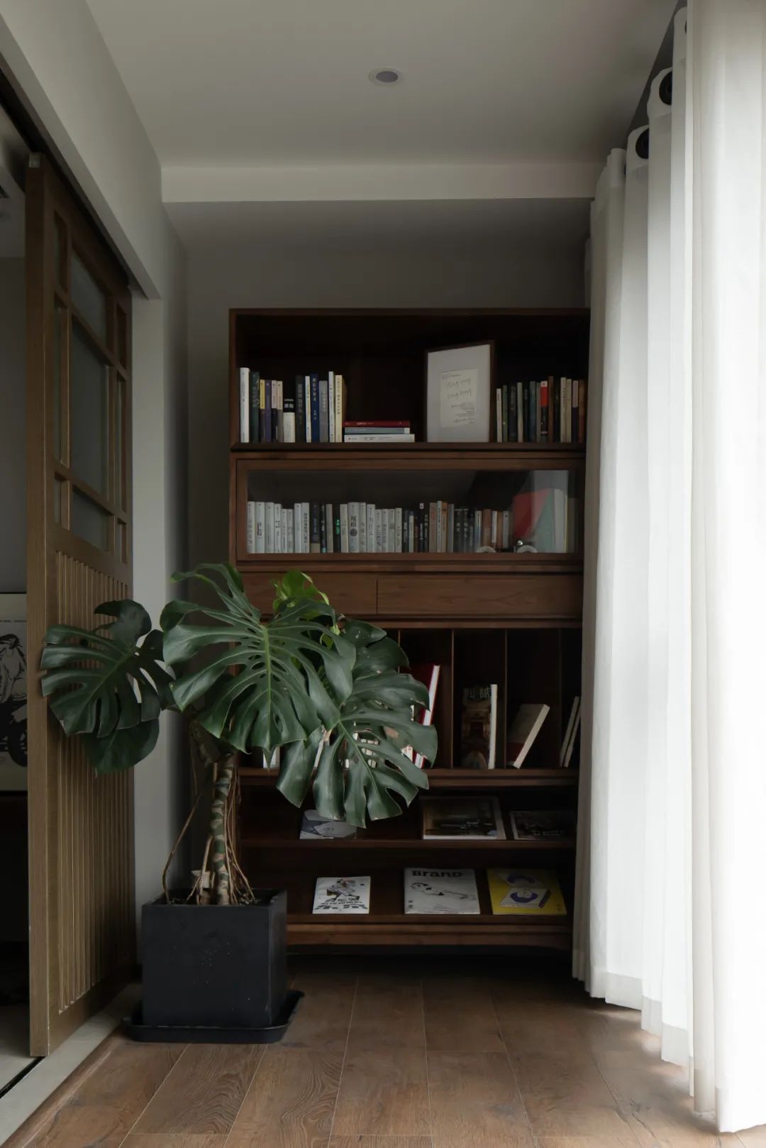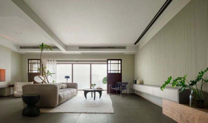 屋主想運(yùn)動(dòng)的同時(shí)可以觀看電影,同時(shí)要有相對(duì)的遮擋隱私,我們?cè)陉柵_(tái)和客廳之間做了可移動(dòng)的隔斷門扇,空間更加完整又不失靈動(dòng)。
