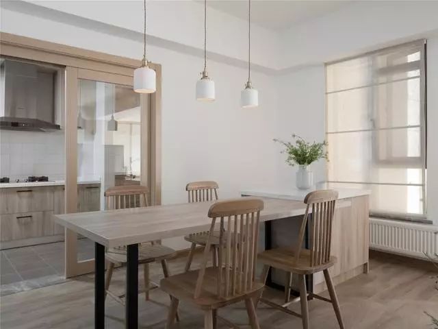 餐廳打造的組合餐桌柜,餐桌延伸過去就是吧臺,3盞簡約吊燈不止起到裝飾作用,溫暖的燈光同樣營造了一個良好的就餐環(huán)境。