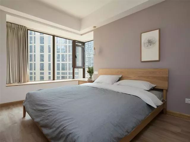 臥室給人的感覺就是舒服,溫潤的日式木床,舒服的棉麻床品,還有金色薄紗一樣的日光,匯集成了不動聲色的溫柔,讓人依戀。全景飄窗適合午后小憩沐浴陽光,同樣適合晚上看城市的萬家燈火。