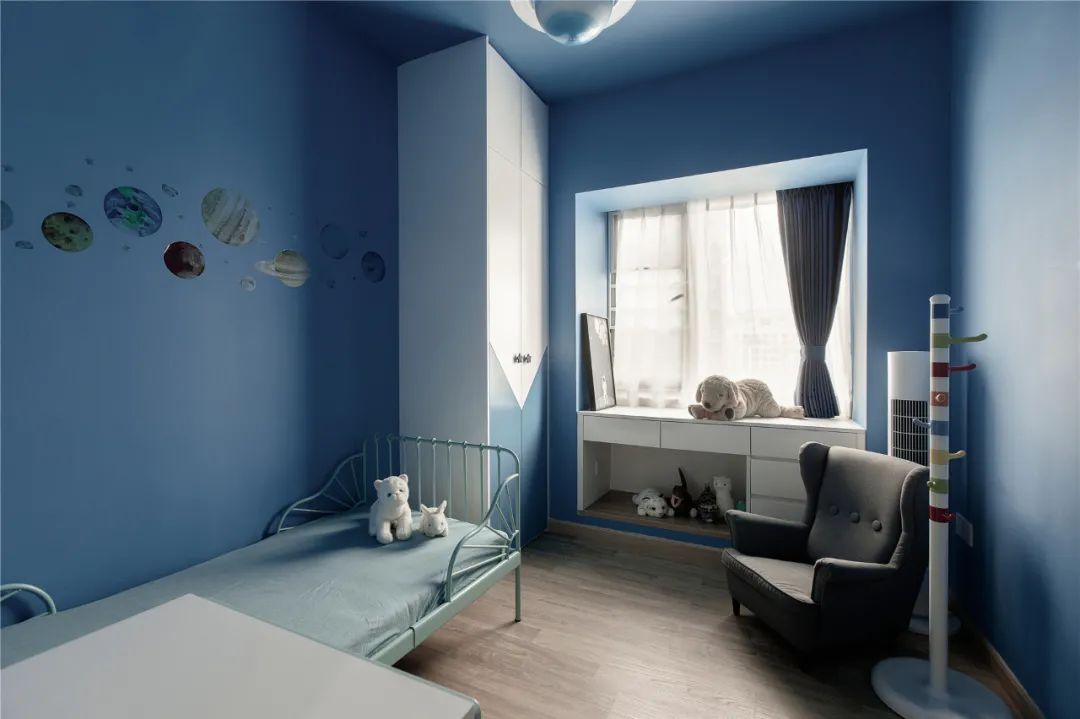 小孩房以藍(lán)色為主題,成品的小孩床,所有家私軟裝靠墻擺放,留給孩子更多的自由活動(dòng)空間,后期改造也很簡(jiǎn)單。