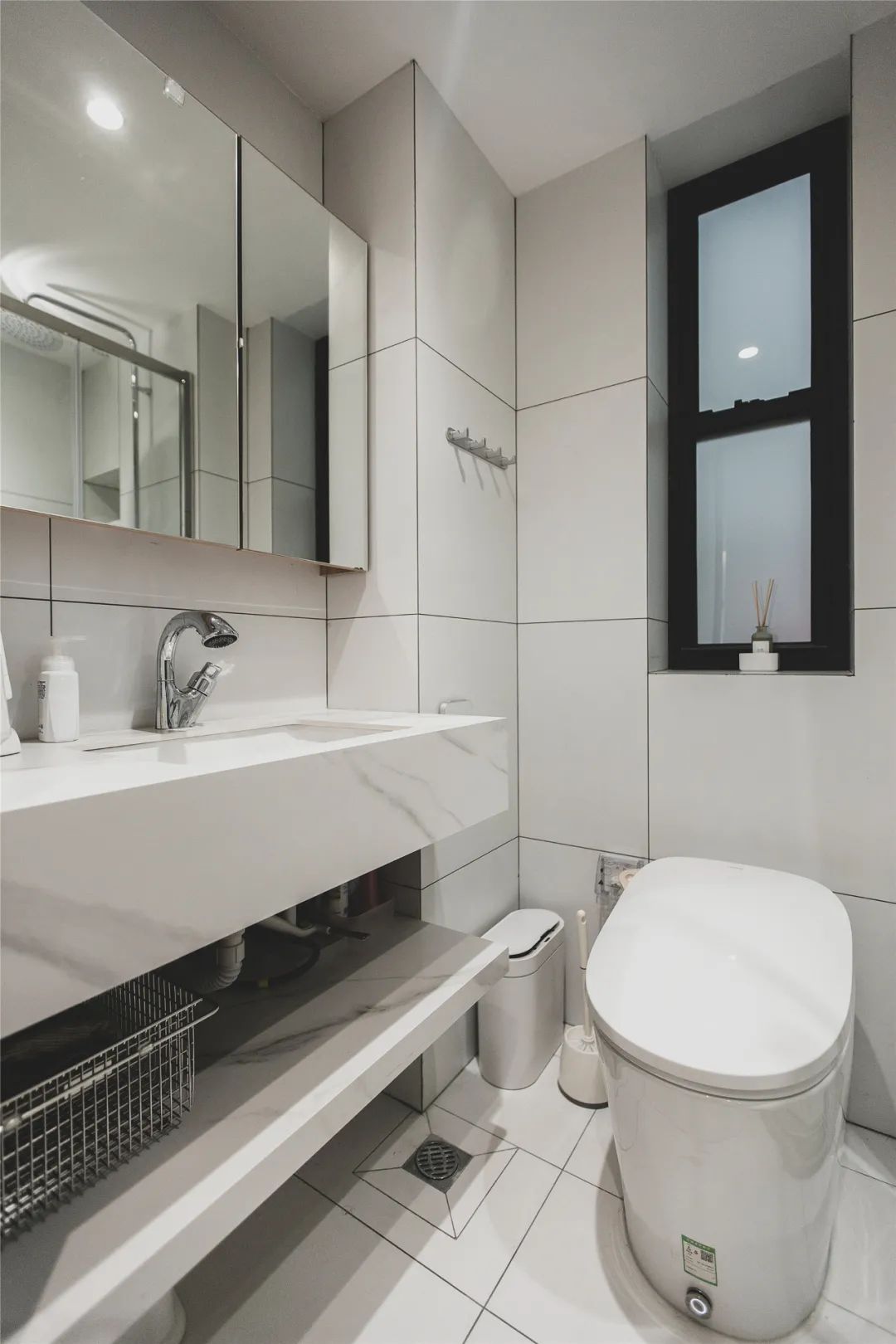 原先暗衛(wèi),現(xiàn)在用通透的白色墻磚提亮整體的空間明度,也顯得干凈整潔。