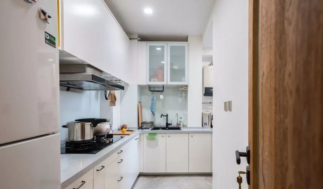 廚房是個(gè)L型的不規(guī)則空間,所以也沿著戶型做了L型的櫥柜,灰色的地磚和臺(tái)面搭配白色的柜子,顯得簡潔而又大方。