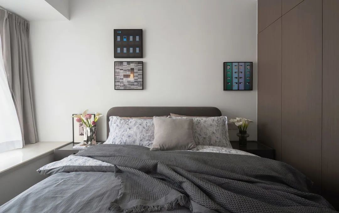 主臥格局還是比較合理通透的,左側(cè)為衣帽間,右側(cè)為陽臺空間,中間部分則是床鋪的位置,通過定制設(shè)計解決床和床頭柜,讓空間百分百得到利用。陽臺封窗處理,與主臥之間不設(shè)隔斷,讓活動空間更寬敞。陽臺打造儲物柜,提升收納能力,以保證空間整潔。