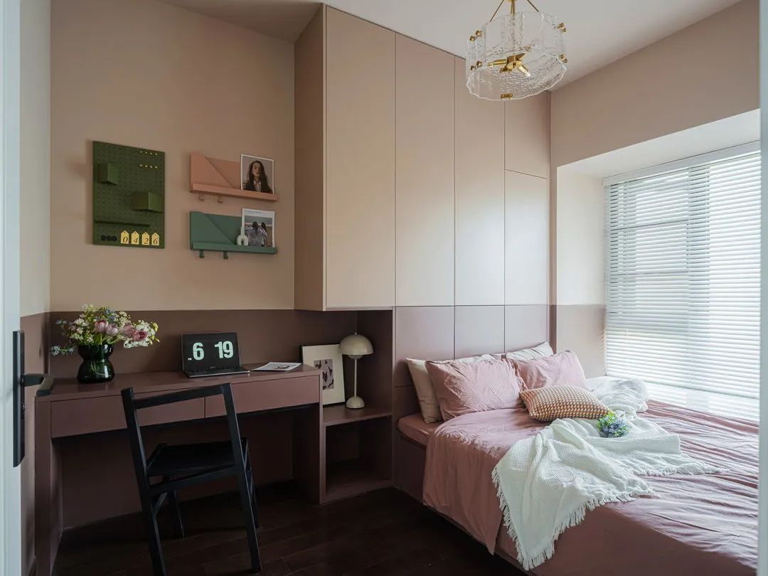 書房從功能性延展出發(fā),采用定制設(shè)計,做了榻榻米、衣柜和書桌一體設(shè)計,滿足了客房、辦公、休閑等需求。由于空間不大,屋主又不希望過冷設(shè)計,因此采用上下分色,以漿果色搭配灰粉色。