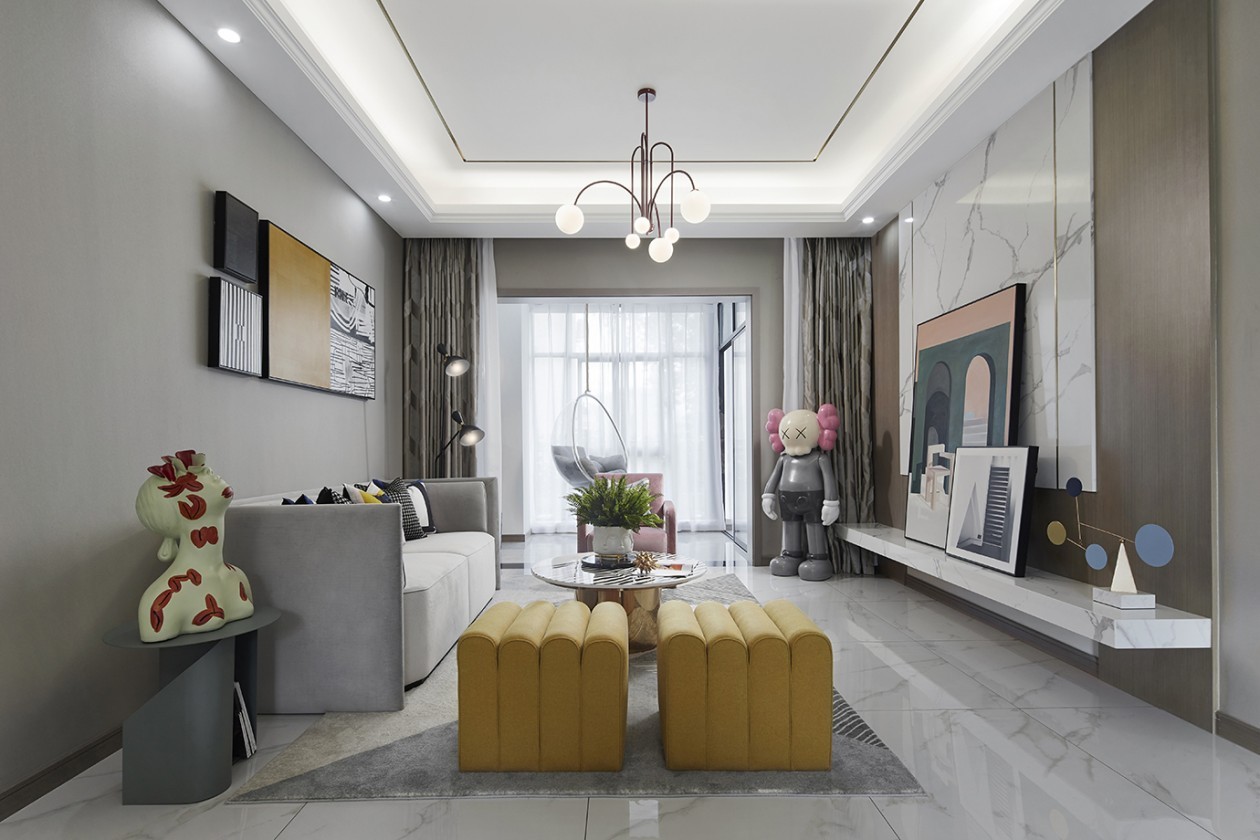 米白質(zhì)感石材和灰調(diào)家具營(yíng)造現(xiàn)代感,一抹明媚的黃率先闖入眼簾,融入簡(jiǎn)約幾何圖形的軟裝飾品