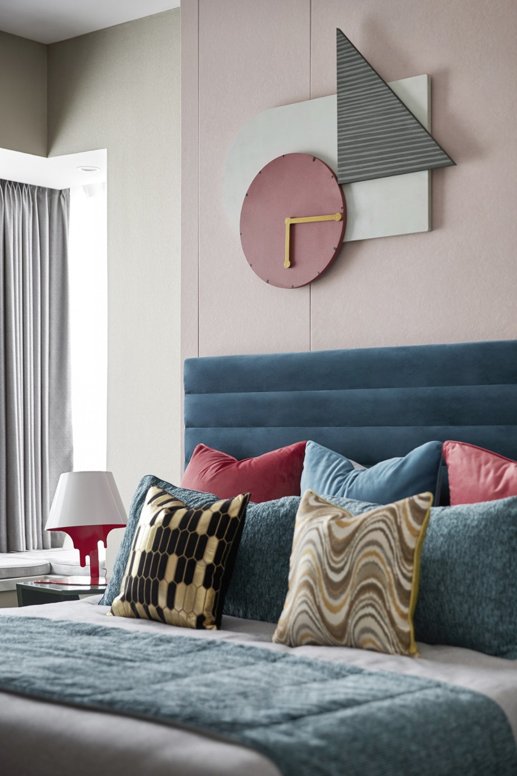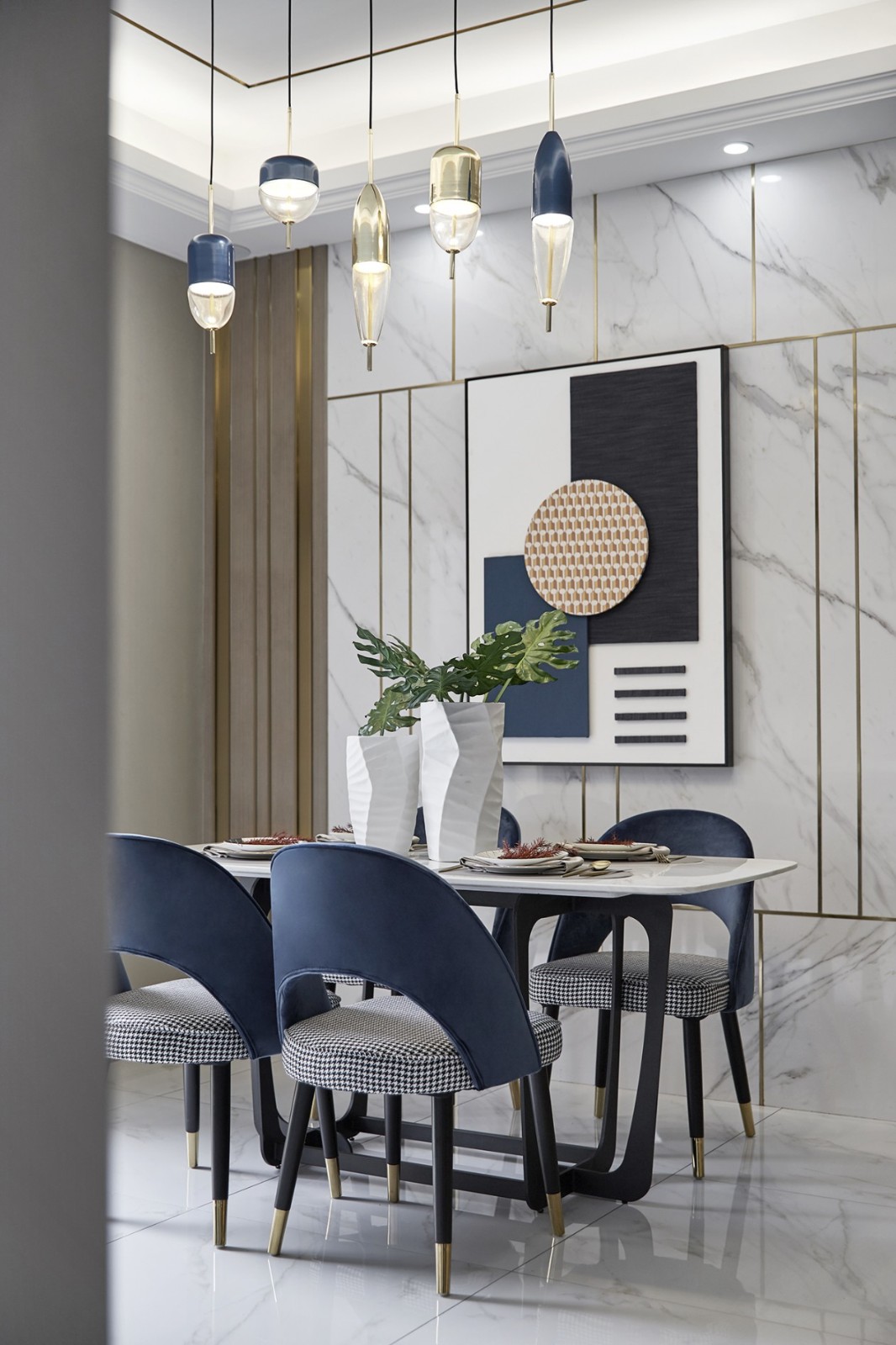 敞開式廚房增加了更多互動(dòng)的場(chǎng)景感,瓶子形制的吊燈將暖黃光線溫柔灑落,映襯著油藍(lán)色的布藝座椅。冷暖色互補(bǔ)的幾何裝飾個(gè)性時(shí)尚賦予空間更深層次的人文氣息。