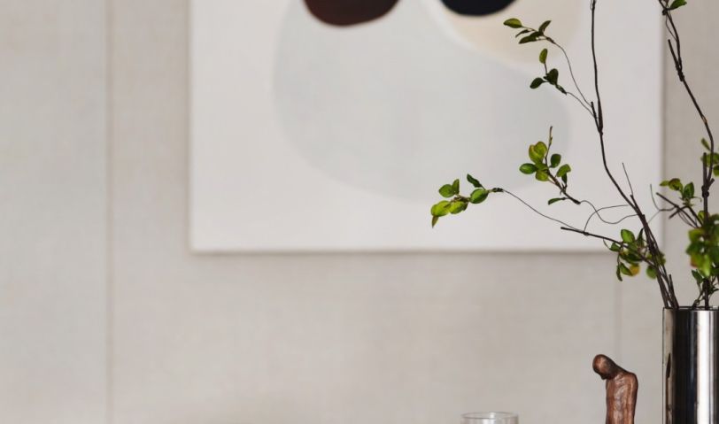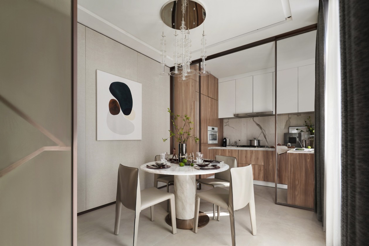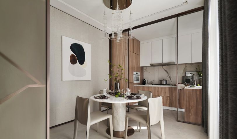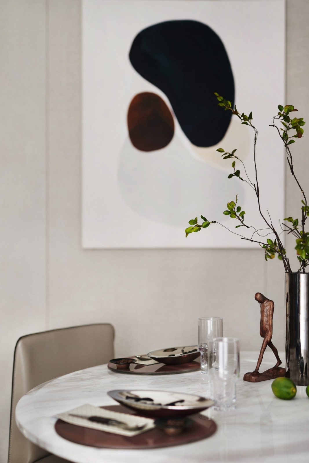 開放式空間,餐桌和廚房形成洄游動線,目光所及之處皆能與自然靜候對望、與藝術呼應對話