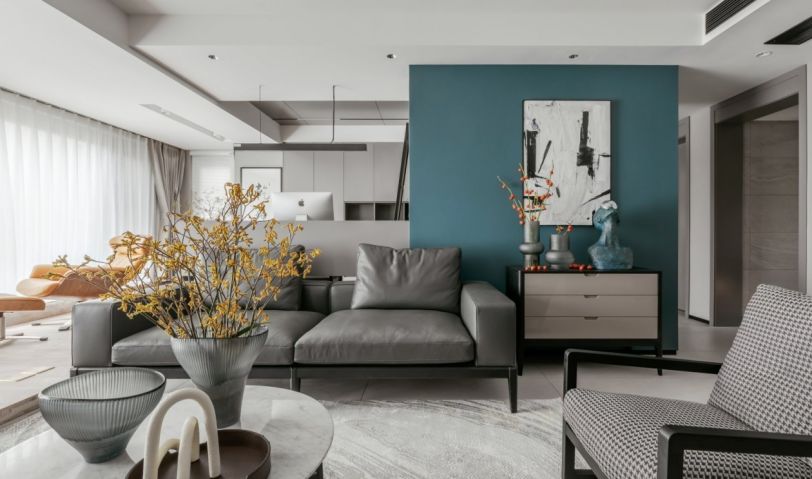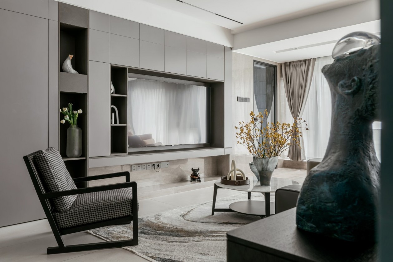 整個(gè)客廳以灰色作為基調(diào),和諧統(tǒng)一,從進(jìn)入空間的一剎那,視線毫無阻隔,大面積落地窗開闊明亮,電視背景收納柜滿足了功能與美感的協(xié)調(diào),沒有過多的造型和裝飾,一切從簡(jiǎn)約出發(fā)。