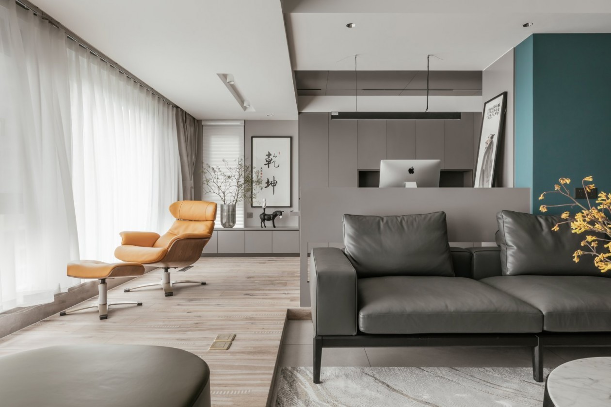 在材質(zhì)上書房與陽臺(tái)用實(shí)木地板相連,空間整體性更強(qiáng)。不停的落差區(qū)分不同區(qū)域。整個(gè)公共區(qū)域形成了“回字形”動(dòng)線,開放寬敞,光線與空氣自由流動(dòng)??臻g沒有了界限,人從身體的舒展延伸到精神的自由。