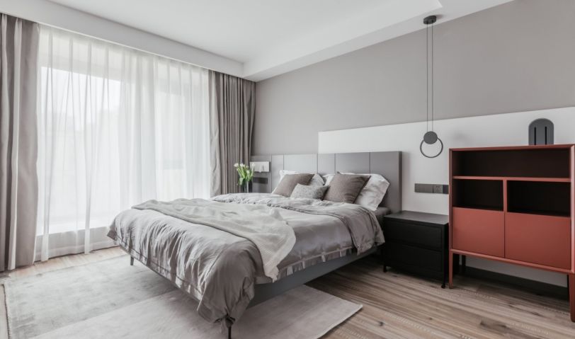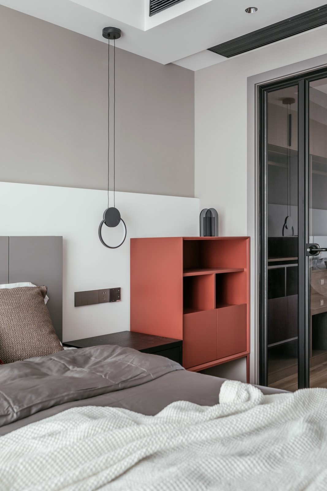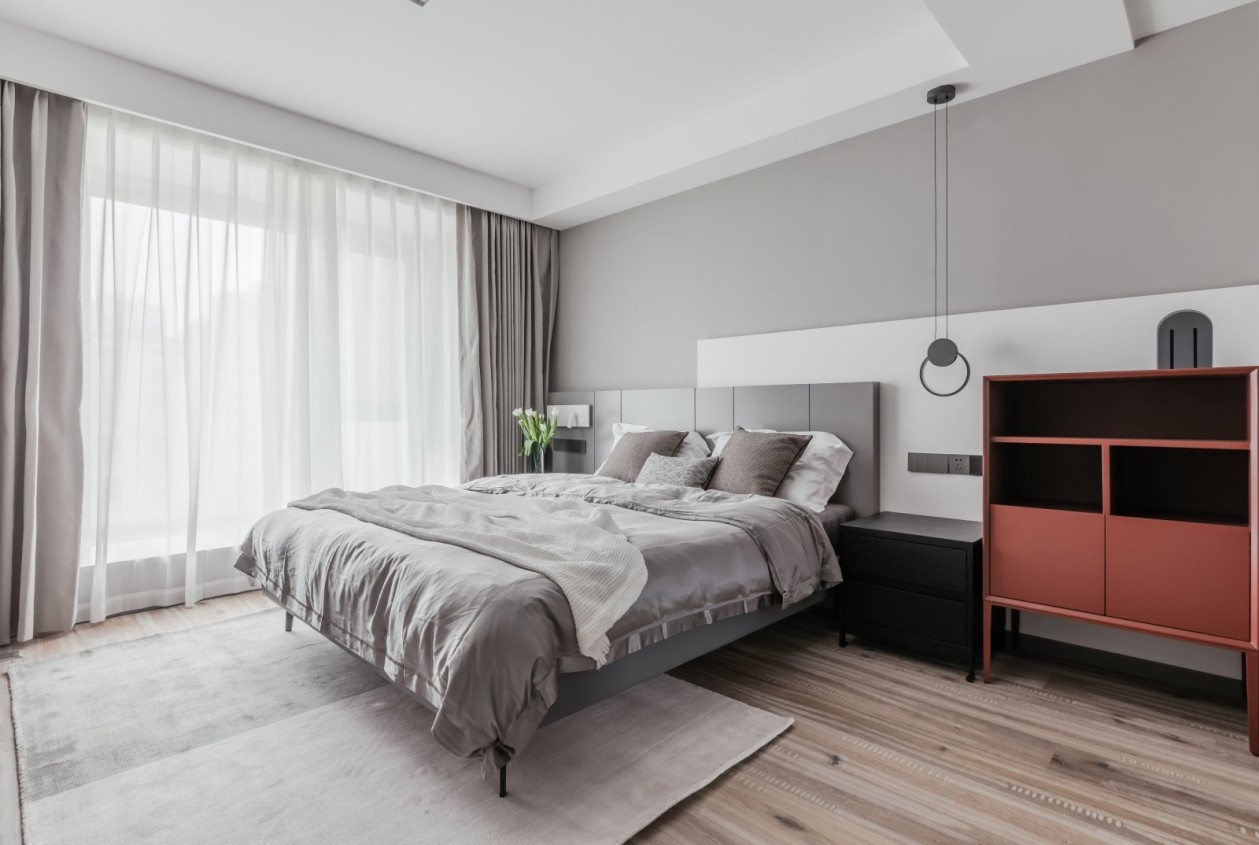 臥空間,設(shè)計(jì)師將灰色與白色疊加進(jìn)行拼接,為背景墻帶來了形式上的變化。線型燈垂墜而下拉伸了空間的視覺感,又極具藝術(shù)氣息。