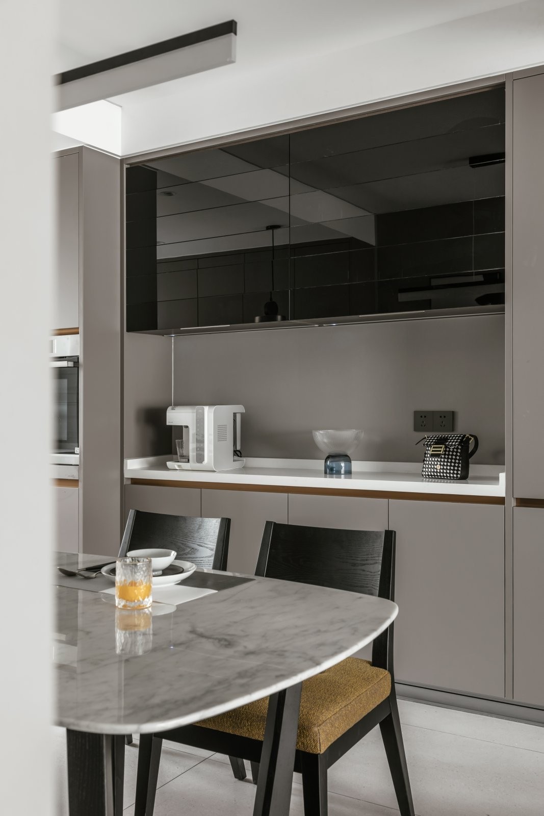 開放式廚房與餐廳相結(jié)合,空間的互動(dòng)與交流增強(qiáng)。