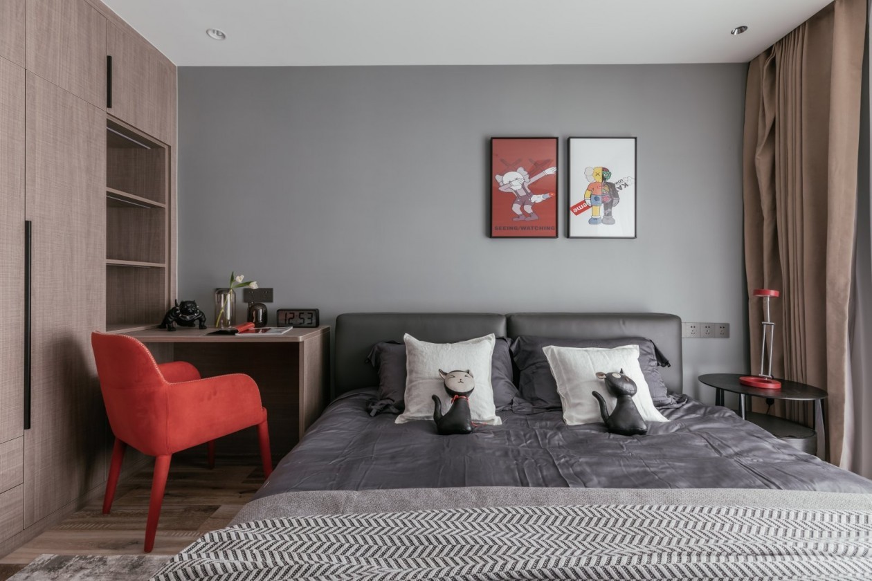 紅色的鐵藝收納邊柜,顏值高又實(shí)用,與床圍的紅色邊柜相呼應(yīng),讓整個(gè)睡眠空間更加輕松愉悅。原木色系衣帽間與衛(wèi)浴相連,生活的舒適與精致讓幸福感倍增。