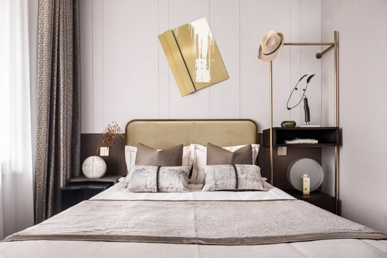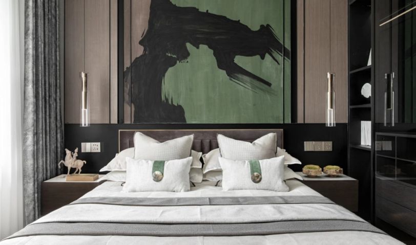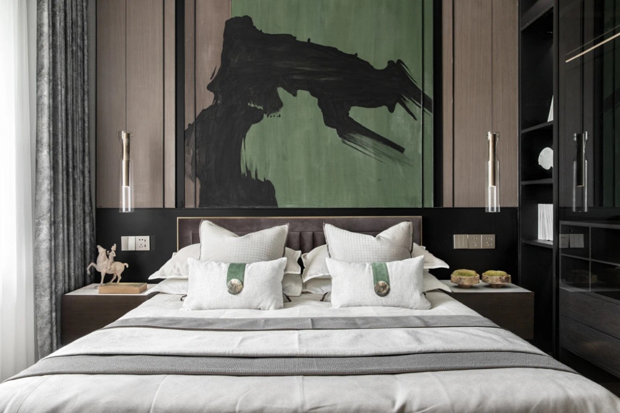 主臥空間巨幅的水墨抽象藝術(shù),將主臥的色彩賦予一種情緒,精細(xì)銀色紋路的邊柜充滿現(xiàn)代動態(tài)的潛能,每一筆細(xì)節(jié)都光彩亮麗