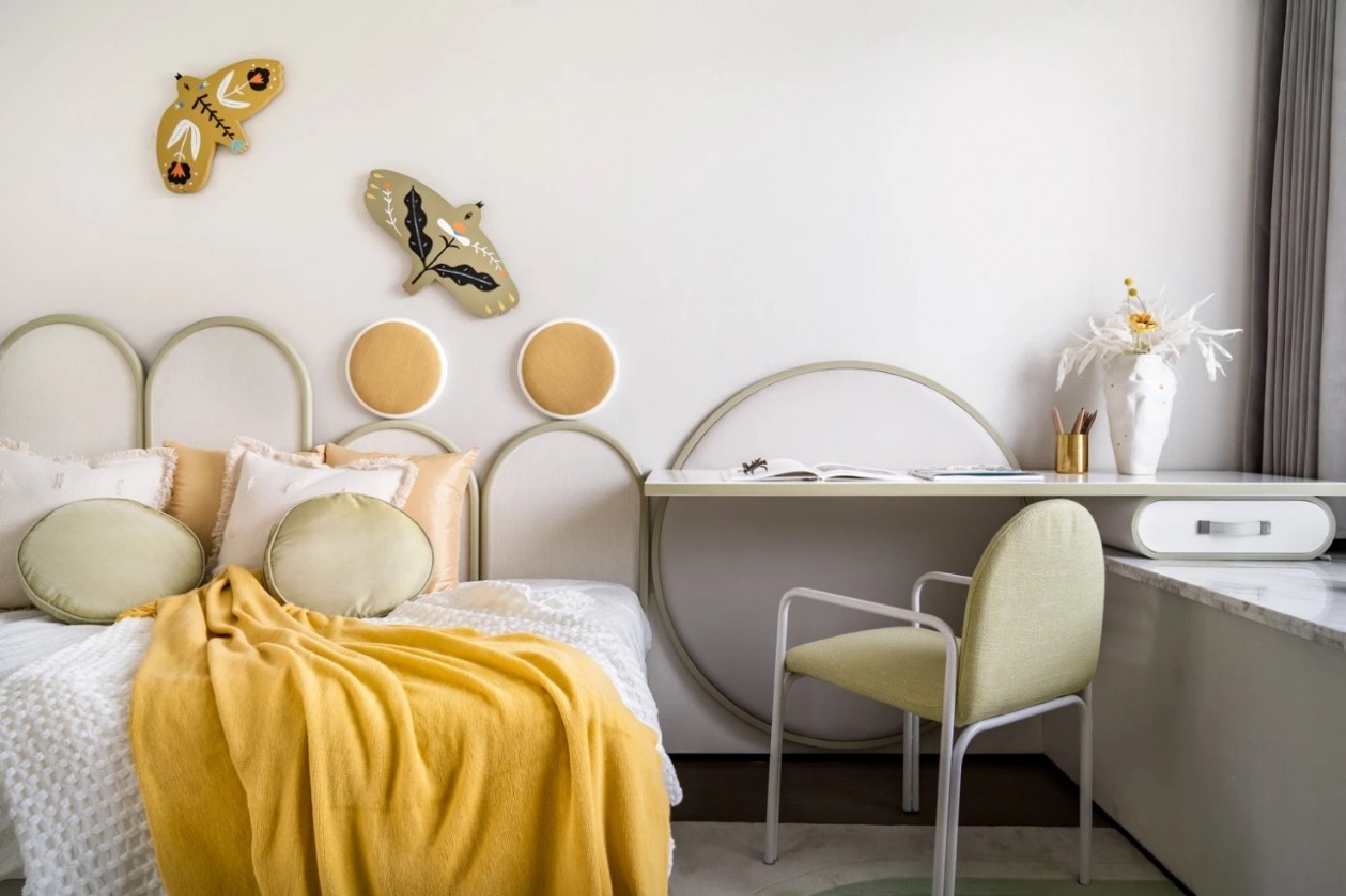 兒童房幼態(tài)的拱形軟包墻飾和與之相對的半圓平臺及鮮亮的明黃色綴飾是極具現(xiàn)代主義的流行時尚