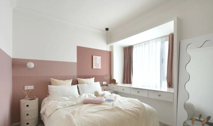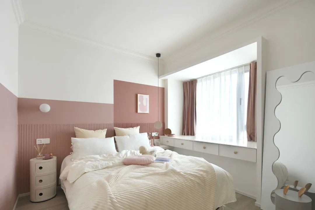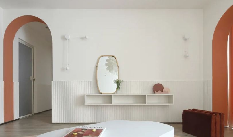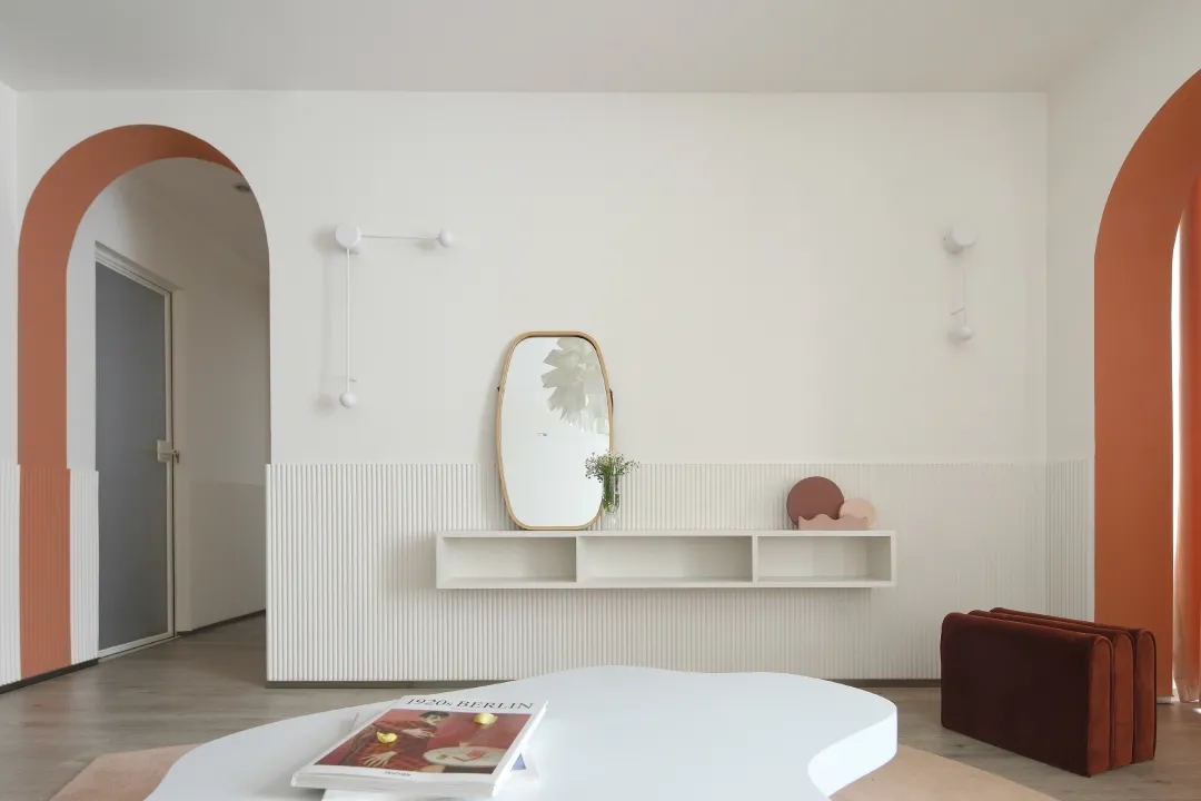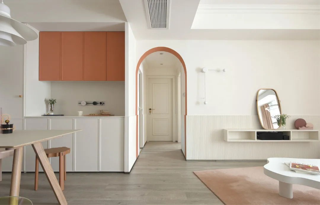 室內以白色和粉橘為主調色, 奶白色簡潔大方又溫柔, 粉橘色則為房子增添了鮮活與甜蜜。