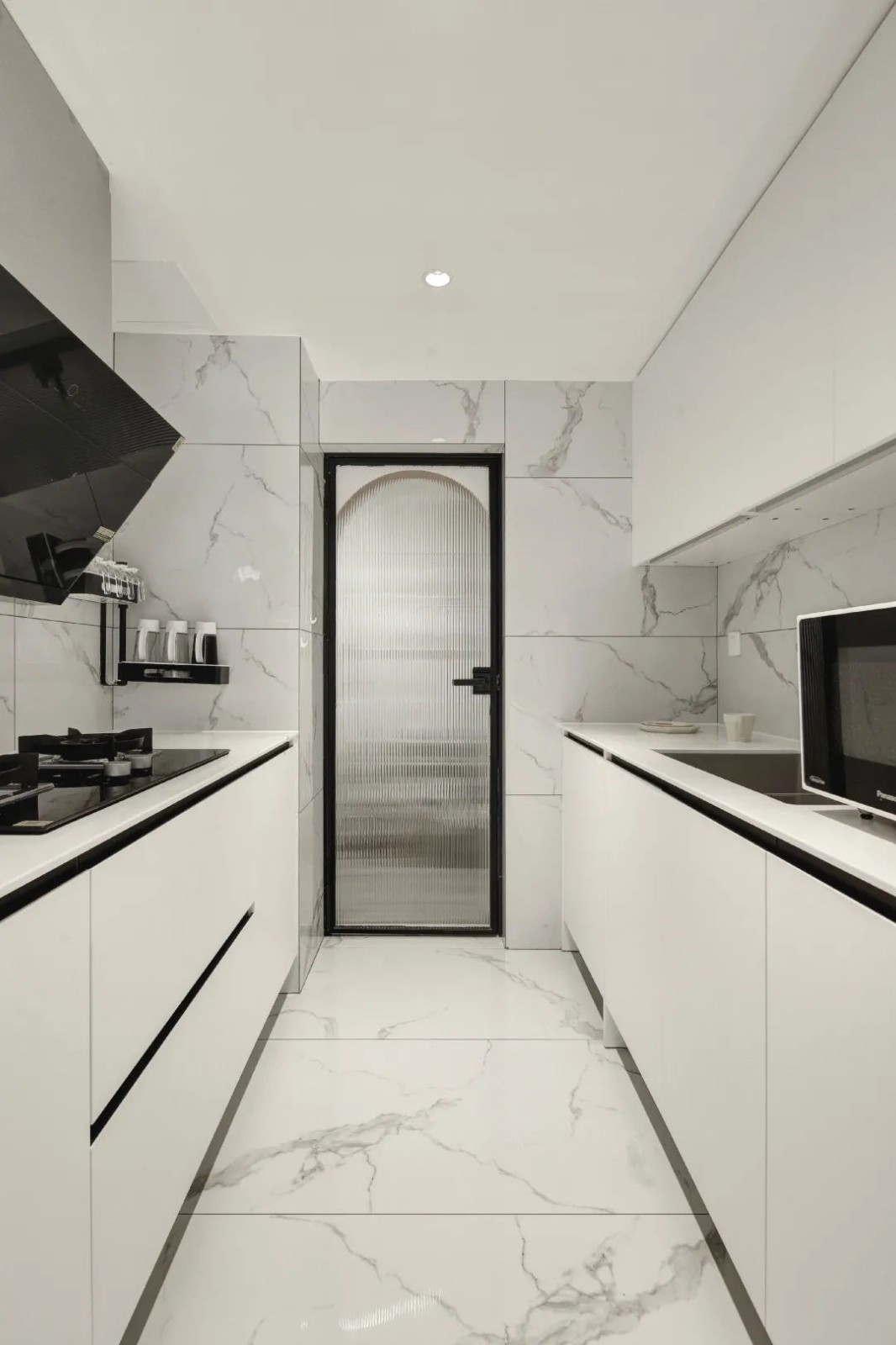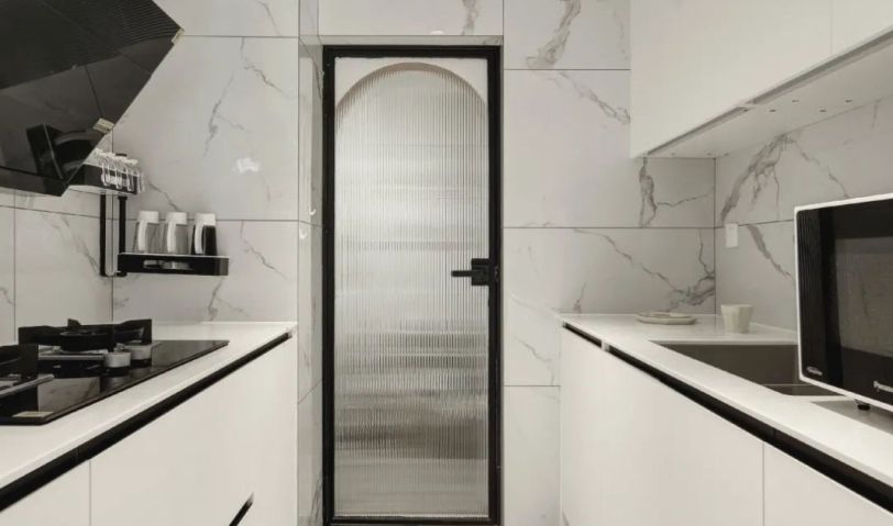 清爽極簡的黑白色廚房,雙一字臺面, 一側用于洗和切,一側用于烹炒, 墻面和地面通鋪大理石紋的瓷磚, 小小的輕奢感,也便于清理。
