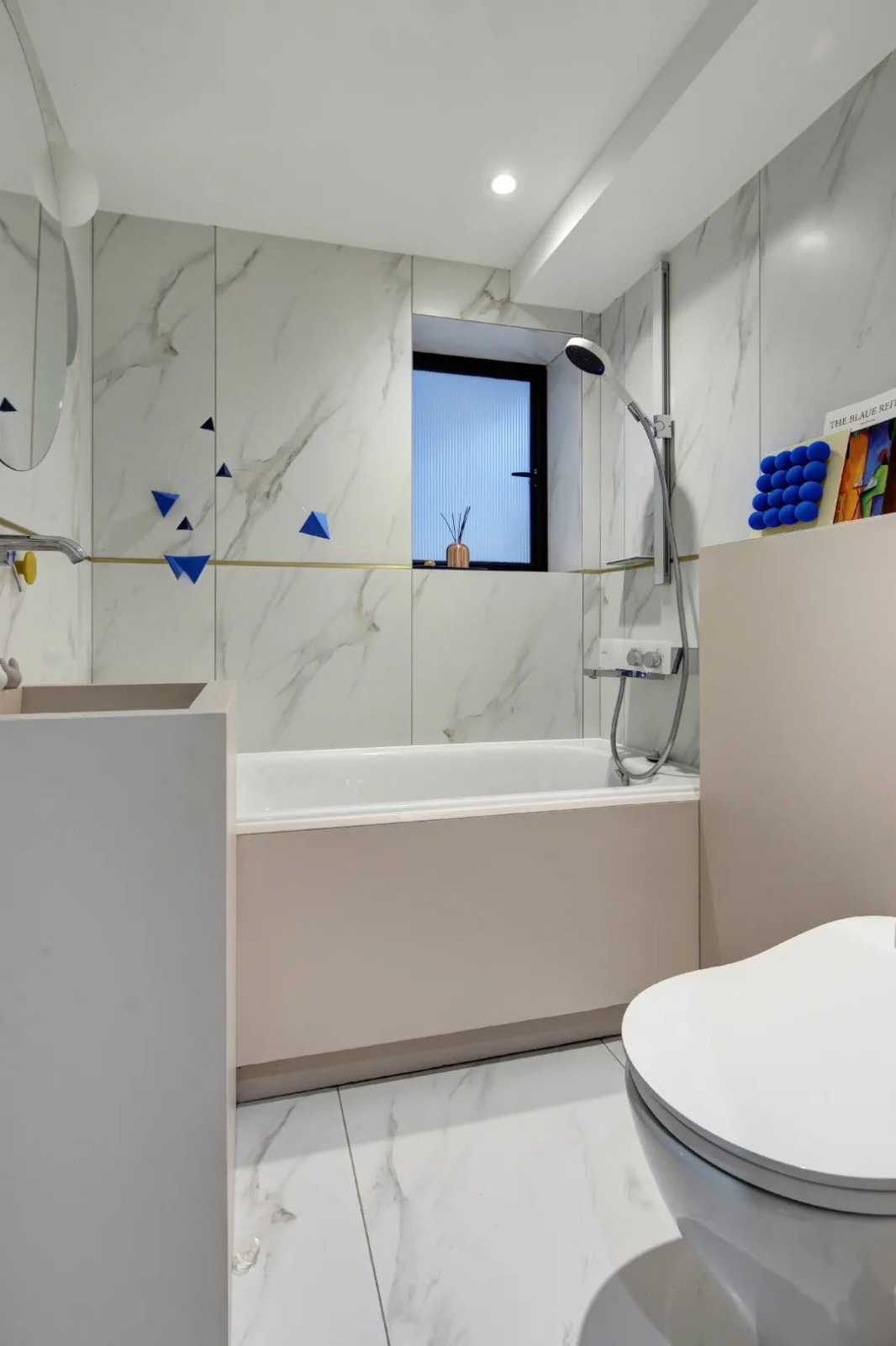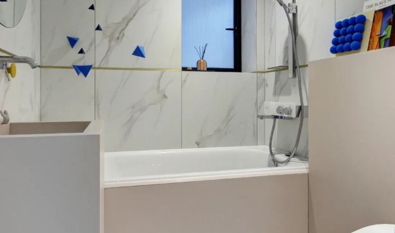 衛(wèi)生間選用偏灰一些的淺粉, 搭配廚房同款的理石紋墻磚和地磚,