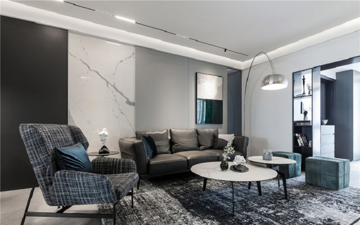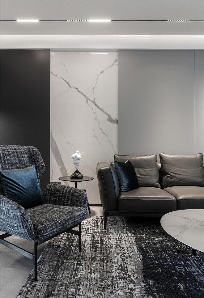 材質(zhì)顏色上面使用了深灰色的護(hù)墻板,中灰的皮沙發(fā)還有地毯,黑色巖板的電視柜,角幾和單人椅子加上華爾思音響。通過多處巖板過渡,使得整個空間顯得非常有層次感和***感。