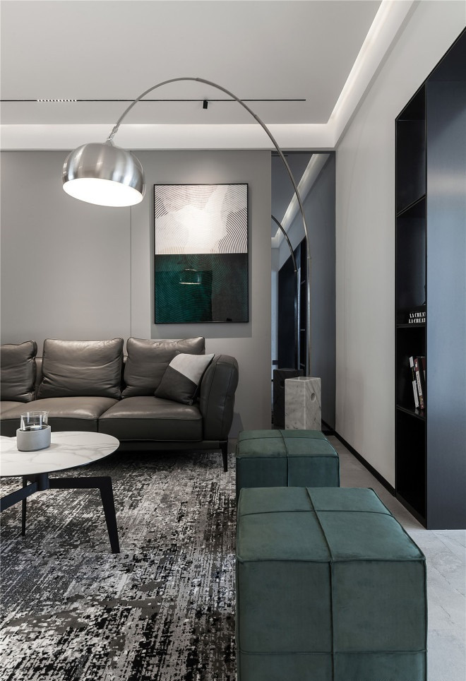 入戶右手邊也設(shè)計了單獨的矮柜,銜接黑色不銹鋼材質(zhì)書架,讓整個客廳空間有了過渡性。