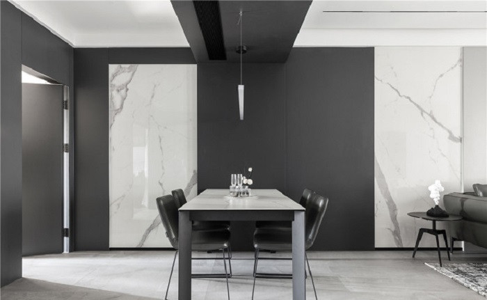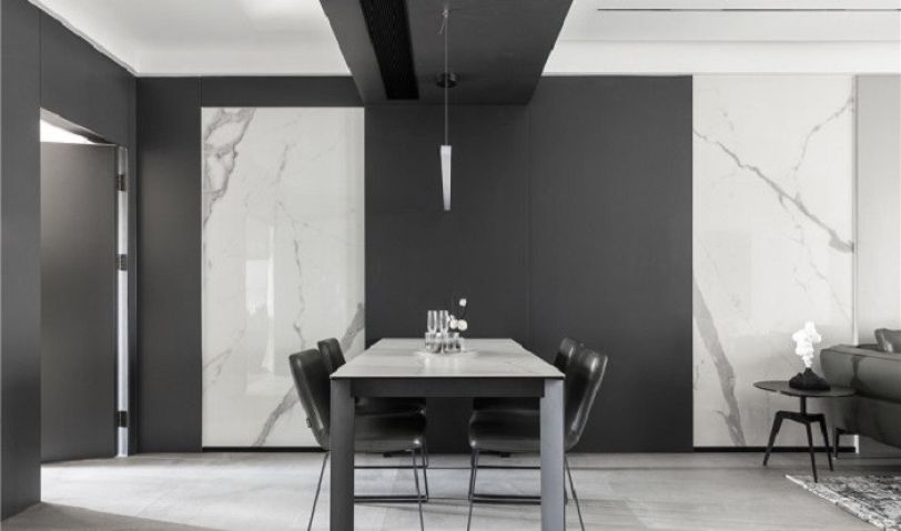 餐廳部分是黑白灰基調(diào), 通過巖板餐桌和墻面巖板的映襯, 還是很配我們的極簡風(fēng)格。