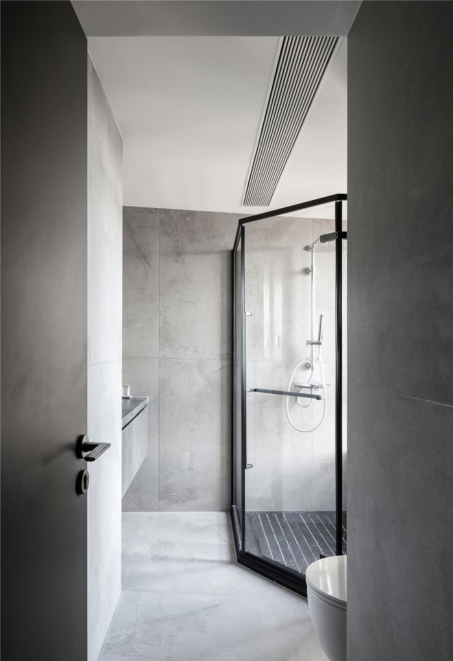 衛(wèi)生間以灰調(diào)墻磚配以白色潔具,還是和客廳一樣的基調(diào)。設(shè)計了無擋水條的處理。淋浴區(qū)下沉3公分,加長型地漏。注重整體性,所有包括客餐廳的地磚及衛(wèi)生間墻地磚,采用了美縫劑。盡量找和磚最接近的顏色。