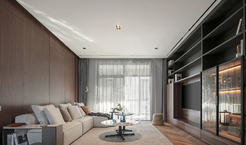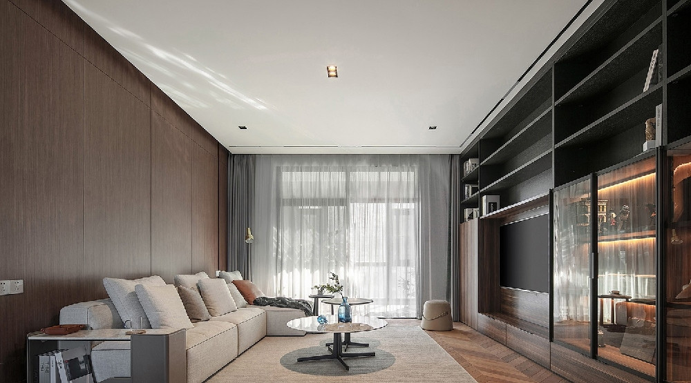 屋主希望客廳要簡潔大氣,電視背景可以留白或做整面的柜子,恰好客廳的尺寸夠大,所以,我們在沙發(fā)背景做了減法,電視墻做了整面展示柜。