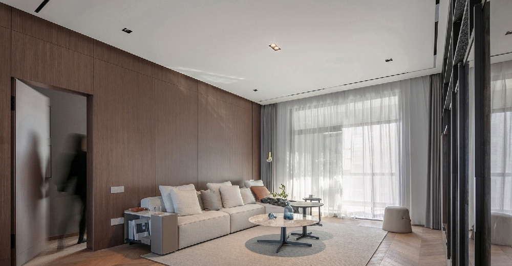 模塊化組合的沙發(fā)和邊幾,搭配著背景墻的簡潔,對(duì)應(yīng)著地毯的圍邊,端莊又靈動(dòng)。