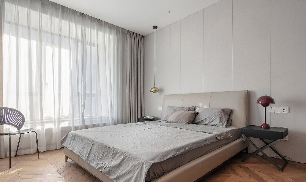 主臥的光線夠好,屋主也希望可以簡潔明亮,床頭淺色的布?jí)Π逑到y(tǒng),恰好滿足了空間需求。