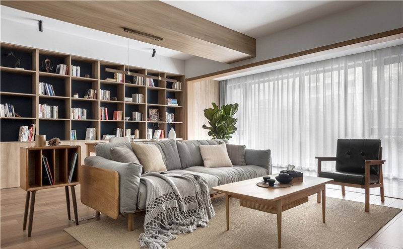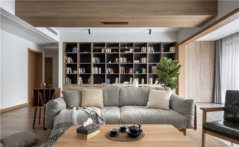 書桌后面為業(yè)主預(yù)留了近4.5米的大書柜,半開放式的柜子里安放著那些緩緩流逝的歲月時光,世界再大,讀過的書會慢慢地變成你的一部分,變成平淡日子里的星星。