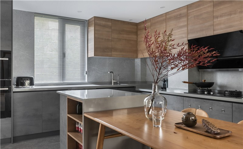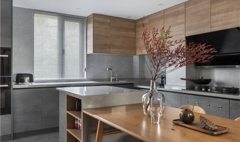 入戶區(qū)設(shè)計師對原有的布局進(jìn)行了調(diào)整,封閉的廚房區(qū)域與逼仄的餐廳區(qū)域都得到了釋放,改造后的廚房除了擁有更好的采光和動線以外,還增加了島臺區(qū)域,空間的靈活性和延伸感都得到了增強(qiáng),實(shí)現(xiàn)了功能化。