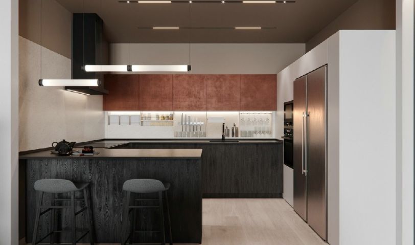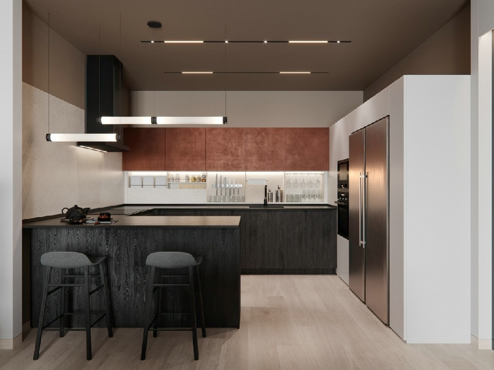 “U”型的廚房操作臺,兩個人同時下廚也不會顯得擁擠,還有足夠的位置放置一些小家電及廚房雜物,操作臺上下都做了儲物柜,廚房收納也不再為難。