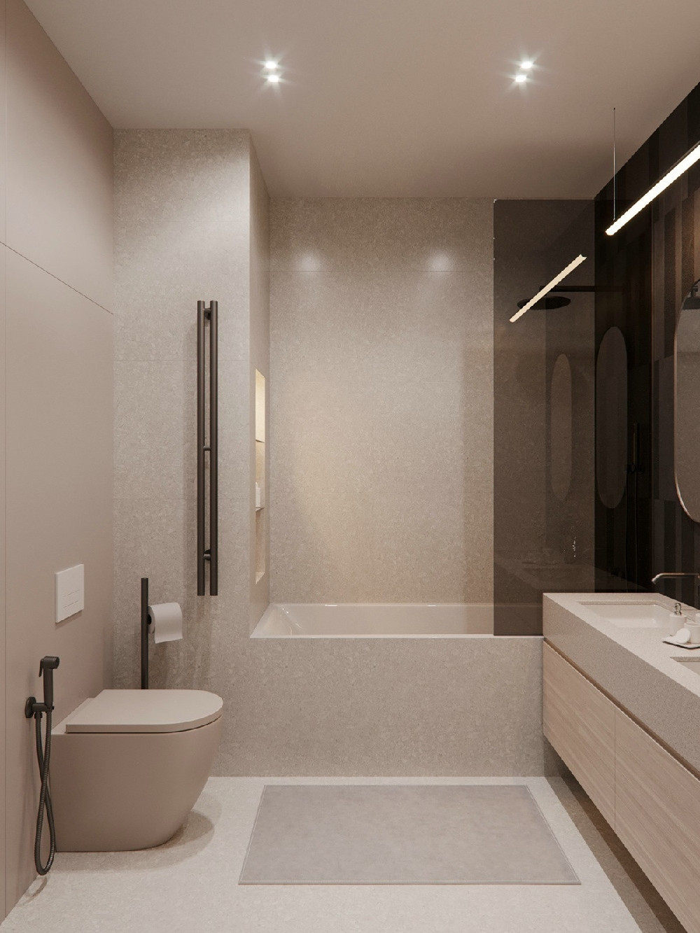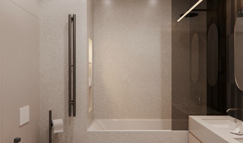衛(wèi)生間沒有窗戶,本案采用了玻璃的的門和局部隔墻,讓衛(wèi)生間更加明亮、通透。