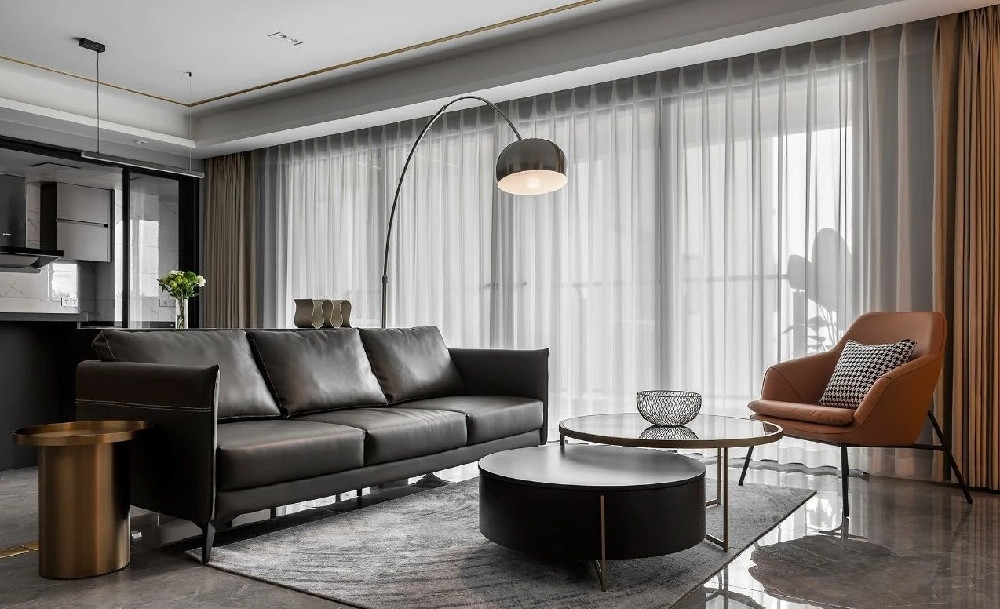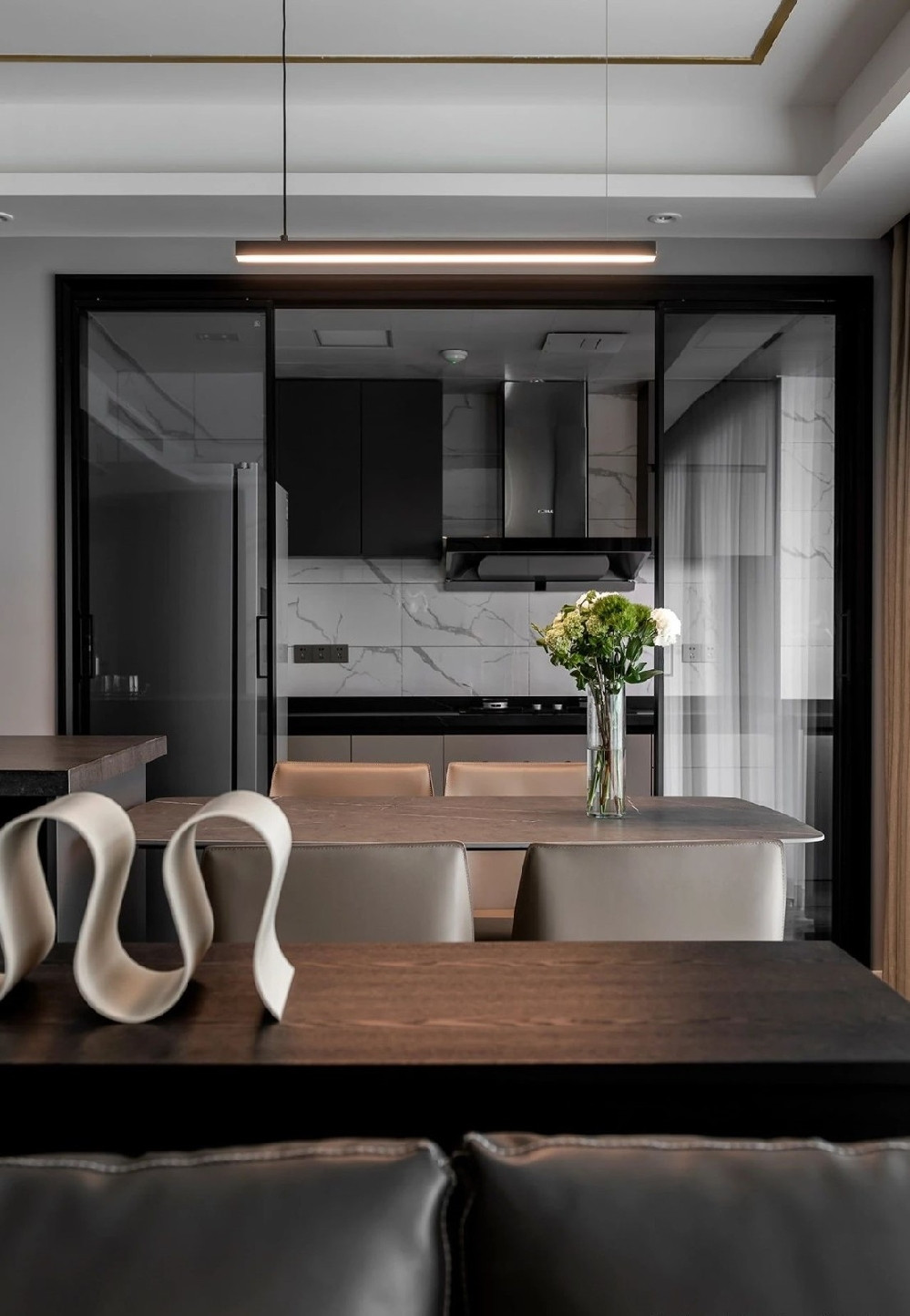 客餐廳以灰色為主調(diào),深色主沙發(fā)配高飽和色休閑椅,金屬元素點綴精致細節(jié)