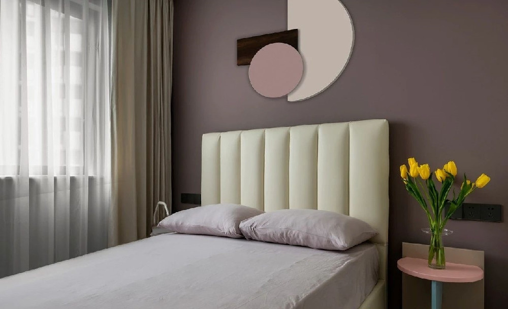 另一個次臥以優(yōu)雅柔美的風格打造,紫粉色系的墻面與墻飾搭配米白色床架,床頭柜俏皮有設計感,與墻飾呼應